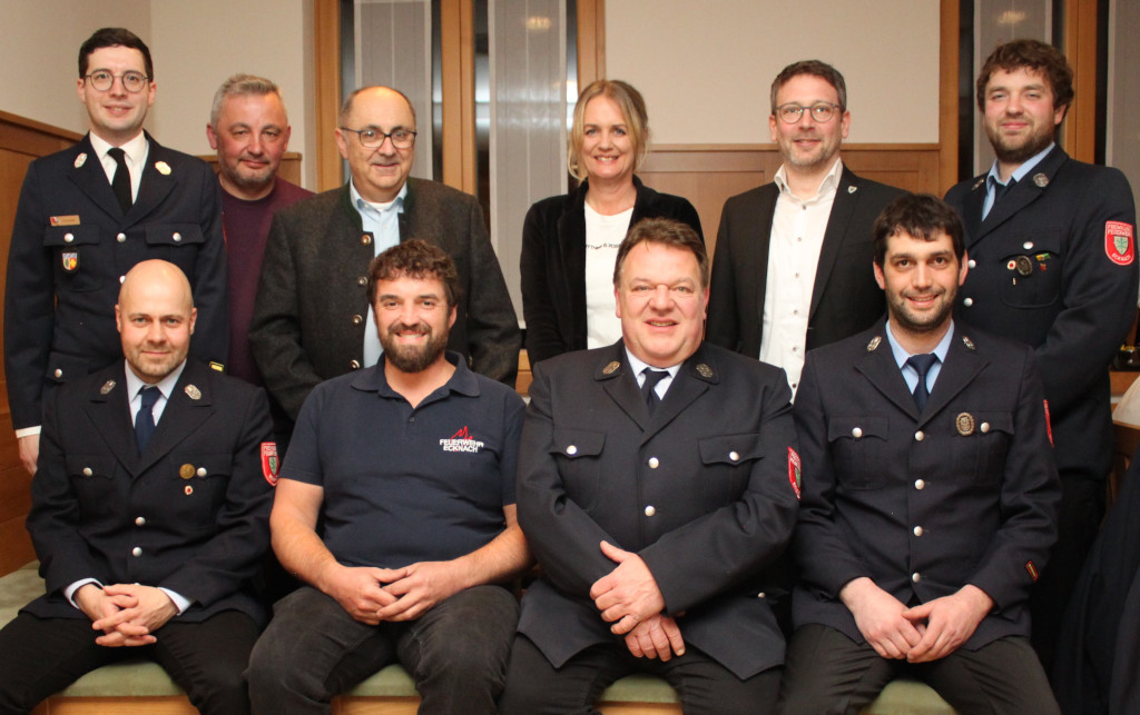 Die neue Vorstandschaft der Freiwilligen Feuerwehr Ecknach zusammen mit den Ehrengästen, sitzend von links: Martin Herb (1. Kassier), Florian Huber (2. Vorstand), Klaus Naß (1. Vorstand) und Andreas Wanner (2. Kommandant). Stehend von links: Kreisbrandmeister Roman Schoder, Stadtrat Manfred Huber, Feuerwehrreferent Peter Meitinger, Martina Huber (1. Schriftführerin), Zweiter Bürgermeister Josef Dußmann und 1. Kommandant Alexander Huber. Foto: Hans Eberle