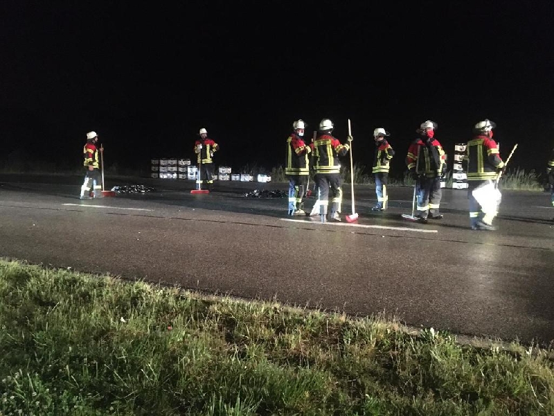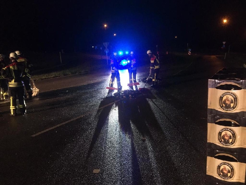 Wenige Minuten nach Mitternacht wurden wir in die Augsburger Straße alarmiert. Eine Polizeistreife hatte dort im Anschluss an den Kreisverkehr bei der B 300 eine größere Menge Bierträger samt kaputter Flaschen entdeckt, die offenbar von einem LKW gestürzt und auf der gesamten Fahrbahn verteilt waren. Nach unserer Ankunft an der Einsatzstelle haben wir über die Leitstelle die Feuerwehr Aichach zur Unterstützung nachgefordert. Während der Reinigungsarbeiten konnte die Polizei das Fahrzeug ermitteln welches das Leergut verloren hatte, es war in der Zwischenzeit in einer Logistikfirma, wo das Leergut zwischengelagert wird. Das Unternehmen schickte unverzüglich einen LKW um die 40 Getränkekästen sowie den beachtlichen Scherbenhaufen aufzunehmen. Nach gründlichem Kehren und anschließendem Abspritzen der Fahrbahn durch die Kräfte der Feuerwehr wurde die Straße durch den Stadtbauhof wieder freigegeben und sämtliche Kräfte konnten abrücken.