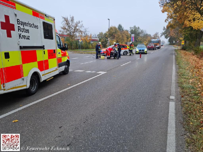 Durch eine Missachtung der Vorfahrt kam es am Samstag Vormittag an der Einmündung der Industriestraße in die Augsburger Straße zu einem Verkehrsunfall. Eine PKW-Lenkerin übersah beim Abbiegen einen vorfahrtsberechtigten Rollerfahrer und rammte ihn. Der Kradfahrer wurde dabei mittelschwer verletzt. Die Einsatzkräfte der Feuerwehren Ecknach und Aichach sicherten die Einsatzstelle, leiteten den Verkehr um und säuberten anschließend die Fahrbahn an der Unfallstelle. Der verletzte Fahrer des Rollers wurde vom Rettungsdienst erstversorgt und ins Krankenhaus gebracht.
