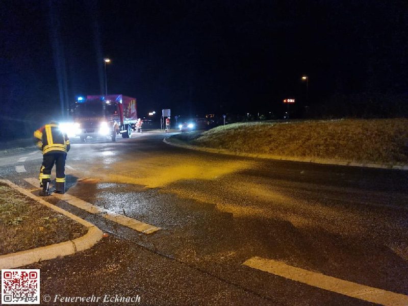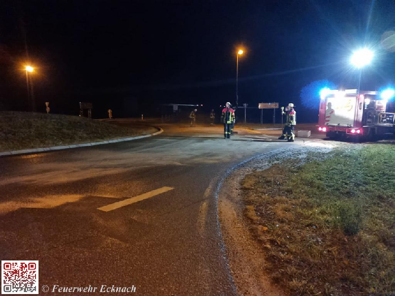 Auf Grund eines Defektes am Tank hinterließ am frühen Samstagabend ein Landwirt eine ausgedehnte Ölspur. Zunächst wurde die Feuerwehr Oberbernbach zur Fahrbahnreinigung alarmiert. Bereits nach wenigen Minuten wurde die Alarmstufe erhöht und die Feuerwehr Aichach sowie die Kreisbrandinspektion, wenig später auch die Feuerwehr Walchshofen nachalarmiert. Nachdem sich herausstellte, dass sich die Ölspur über die Bahnhof- und die Franz-Beck-Straße, sowie weiter über die Augsburger Straße bis zum Kreisverkehr an der Anschlussstelle AIC West der B 300 zog, erfolgte auch bei der Feuerwehr Ecknach der Alarm. Ziemlich rasch war klar, dass der Ölspur durch die Kräfte der Feuerwehr allein nicht beizukommen war, somit erfolgte die Organisation einer Kehrmaschine und die Feuerwehren konzentrierten sich auf die Reinigung von Kreisverkehren, Einmündungen und Straßenkreuzungen da durch zusätzliche Nässe auf der Straße teils gefährliche Situationen für Verkehrsteilnehmer entstanden.
