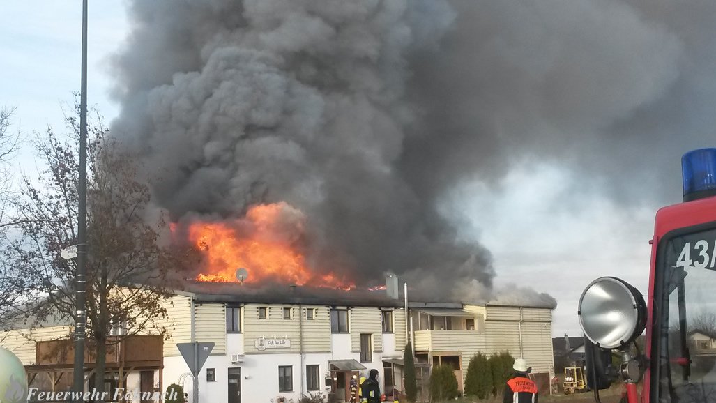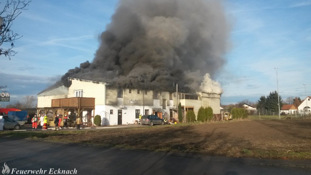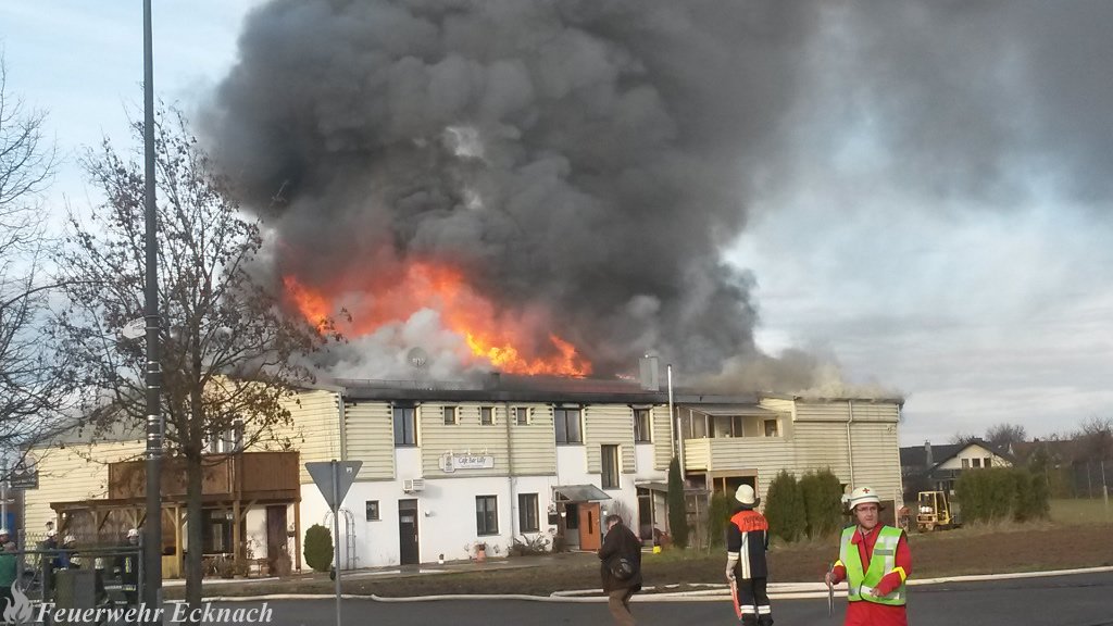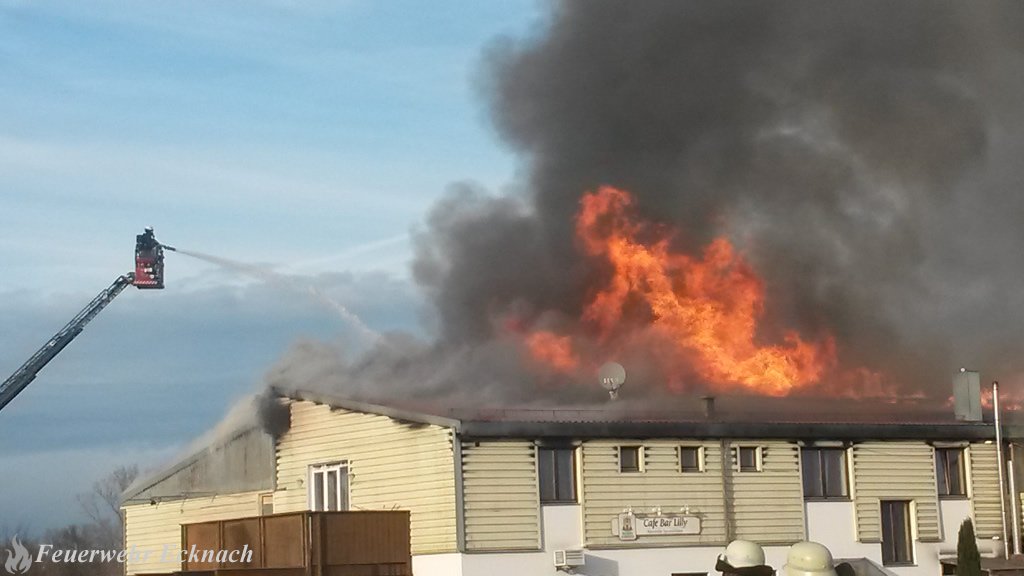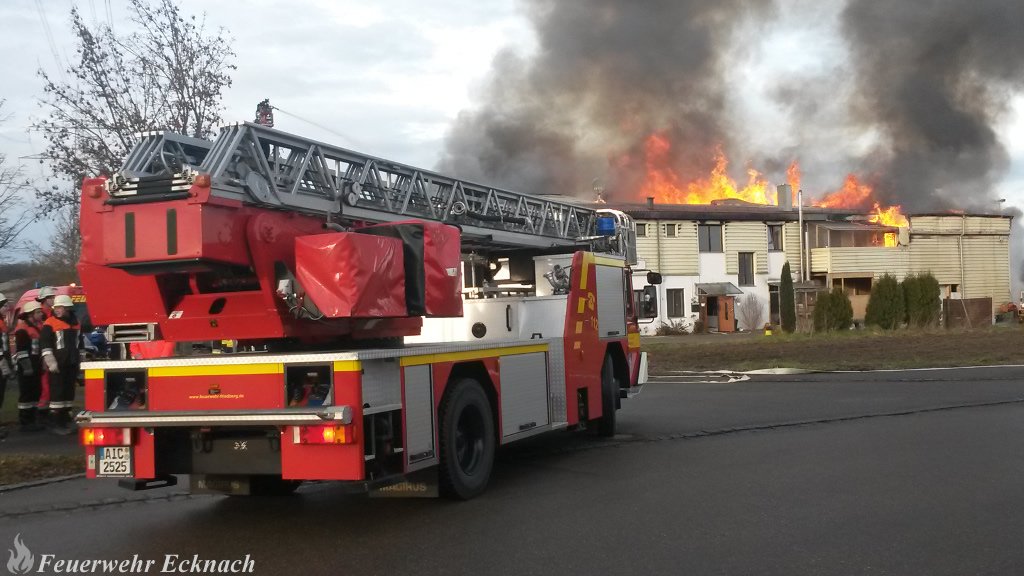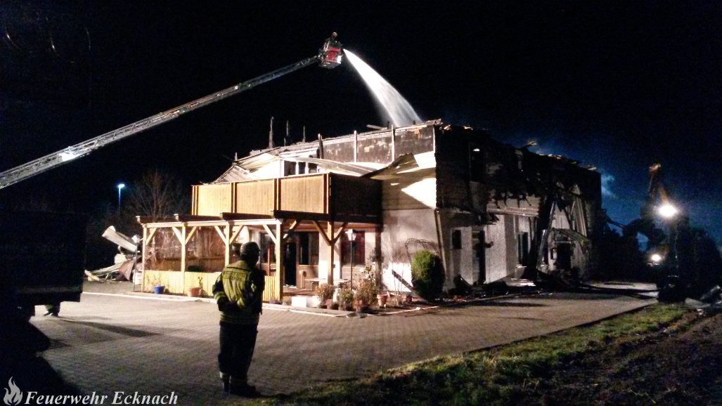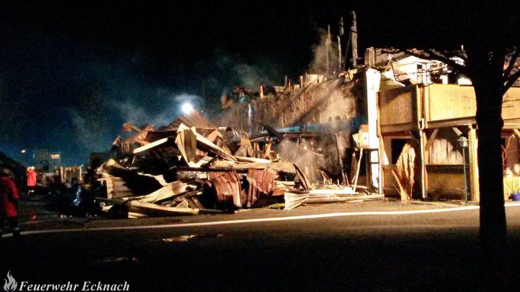 Das Gebäude brannte noch bis spät in den Abend. Mit schwerem Gerät wurden Teile der Halle abgerissen um weiter an den Brandherd vorzudringen. Die Feuerwehr Ecknach übernahm die Brandwache.