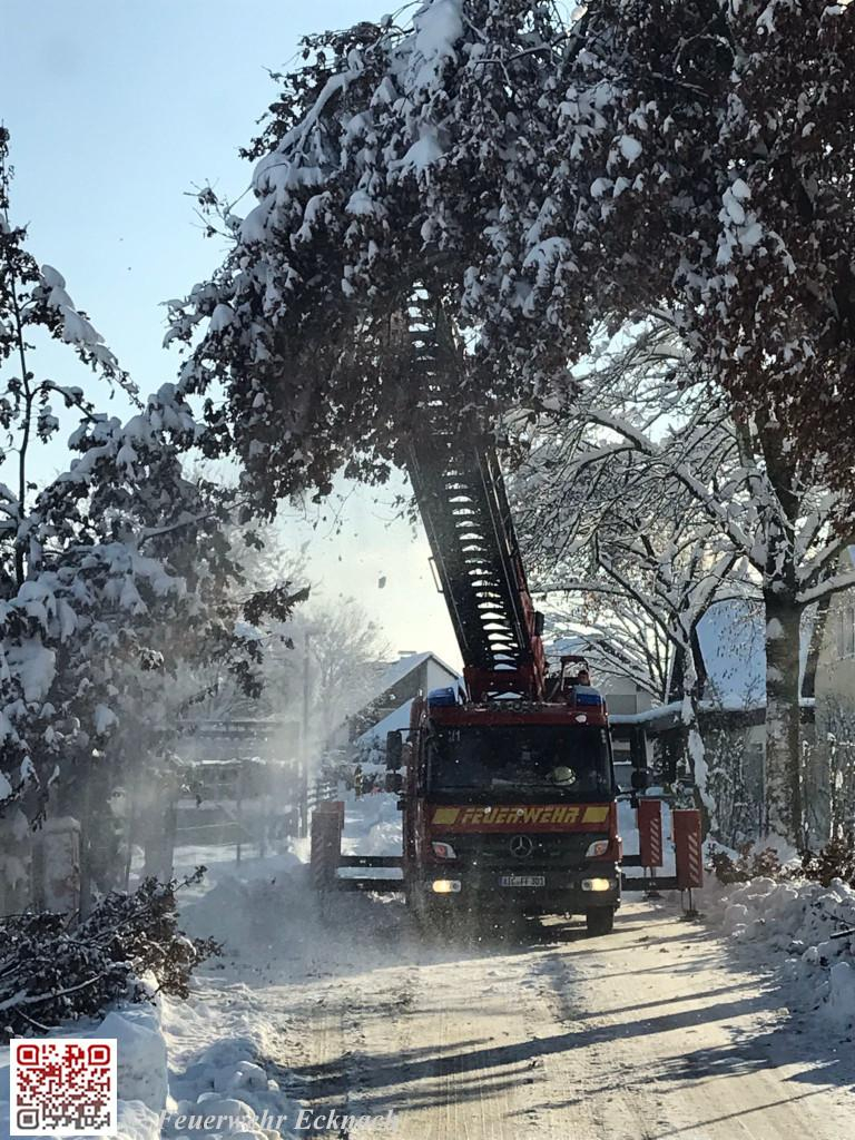 Durch den starken Schneefall der vergangenen beiden Tagen drohten einige große Äste eines Baumes in der Erlenstraße unter der schweren Last abzubrechen und auf die Straße zu stürzen. Sie wurden, da sie schon stark eingerissen und abgeknickt waren, von der FF Aichach von der Drehleiter aus abgesägt und durch die Ecknacher Kräfte, die währenddessen die Straße sperrten, von der Fahrbahn entfernt.