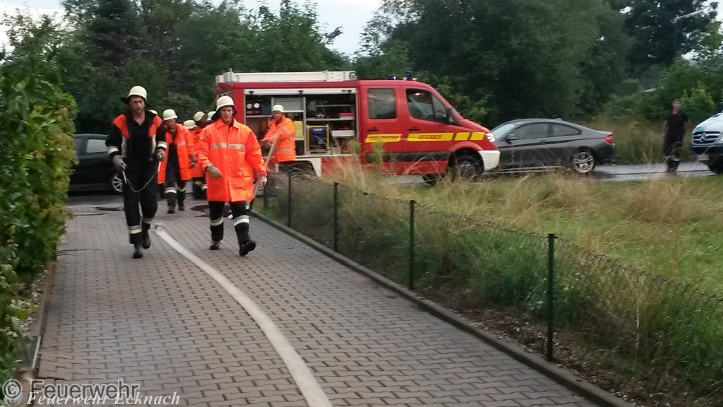 Am Sonntag abend, wir waren gerade mit den Abbauarbeiten unseres Grillfestes fertig, fegte ein heftiges Unwetter mit anhaltendem Starkregen über Aichach hinweg. Dieser ließ in kurzer Zeit Keller volllaufen und Straßen überfluten. Um kurz nach 18:00 Uhr alarmierte uns schließlich die ILS Augsburg. In der Pfarrer-Steinacker-Str. sowie in der Drei-Linden-Str. mussten Gullys freigespült werden und im Anschluss völlig verschlammte Straßen mit Strahlrohren gereinigt werden. Im Verlauf des Einsatzes kamen noch die Wehren von Klingen und Motzenhofen zur Unterstützung. Im anschließenden Folgeeinsatz musste in der Erlenstr. ein völlig vollgelaufener Hof ausgepumpt werden.