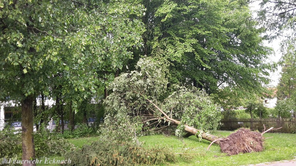 Auf seinem verheerenden Weg der Verwüstung richtete der Tornado am Mittwochabend auch in Aichach große Schäden an. Zur Unterstützung der Feuerwehr Aichach wurden wir von der Leitstelle Augsburg alarmiert und schließlich über die Kreiseinsatzzentrale Aichach in die Wilhelm-Wernseher-Str. beordert. Dort waren zahlreiche umgestürzte Bäume sowie ein umgeknickter Laternenmast von der Straße zu räumen. Anschließend reinigten wir die Münchener Straße von herumliegendem Dachziegelschutt und sicherten einige lose Ziegel auf einem Dach.