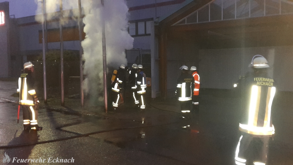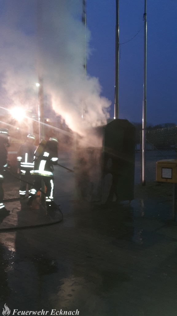 Durch eine mutwillig eingeworfene Feuerwerksrakete geriet am späten Nachmittag des Sylvestertages ein Altkleidersammelcontainer in Brand. Der Angriffstrupp des ebenfalls alarmierten LF 20 der Feuerwehr Aichach rückte wegen der starken Rauchentwicklung unter schwerem Atemschutz vor, brach den Container auf und löschte den Brand. Mittels Wärmebildkamera wurde das Brandgut anschließend auf versteckte Glutnester kontrolliert. In unmittelbarer Nähe des Containers befanden sich mehrere Gitterboxen mit Brennholz sowie der hölzerne Anbau eines Gewerbebetriebs. Dieser Bubenstreich hätte also auch andere Dimensionen annehmen können!