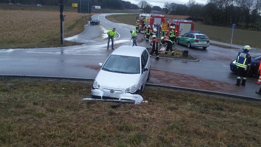Zu einem kuriosen Unfall kam es am Dienstag im Kreisverkehr an der B300 bei der Anschlußstelle AIC West. Ein Autolenker verlor die Kontrolle über sein Fahrzeug, überfuhr eine Verkehrsinsel und kam im inneren Grünbereich des Kreisverkehrs zum stehen. Der Fahrer blieb unverletzt, am Fahrzeug entstand erheblicher Schaden. Zusammen mit der Feuerwehr Aichach reinigten wir die Fahrbahn und unterstützten die Polizei bei der Verkehrsregelung.
