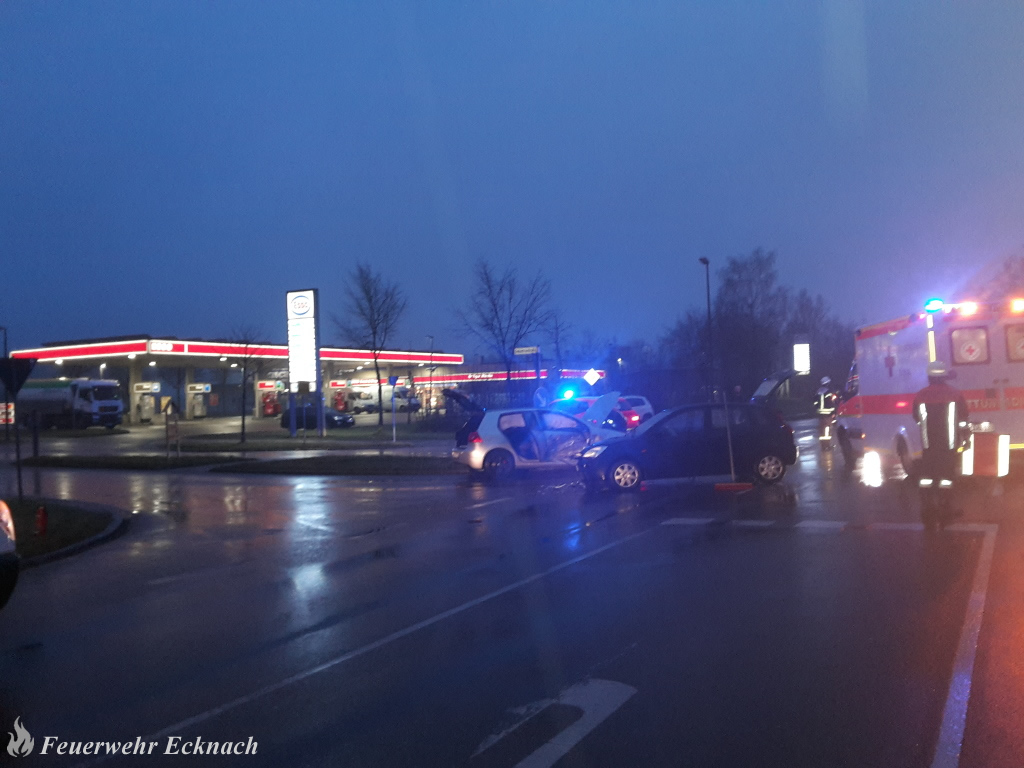 Am frühen Morgen kam es an der Einmündung der Industriestraße in die Augsburger Straße zum Zusammenprall zweier PKW weshalb neben dem Rettungsdienst auch die Feuerwehr alarmiert wurde. Die erste Einsatzinformation der Leitstelle, dass eine Person eingeklemmt sei, bestätigte sich glücklicherweise nicht, bei unserer Ankunft an der Unfallstelle waren die beiden Fahrer die leicht verletzt wurden bereits nicht mehr in ihren Fahrzeugen und wurden vom Rettungsdienst medizinisch versorgt. Daher konnten die Kräfte der Feuerwehr Aichach direkt nach dem Eintreffen wieder abrücken. Die Feuerwehr Ecknach übernahm die Sicherung der Einsatzstelle, die Verkehrsregelung sowie die Fahrbahnreinigung nach der Bergung der Fahrzeuge durch das Abschleppunternehmen.