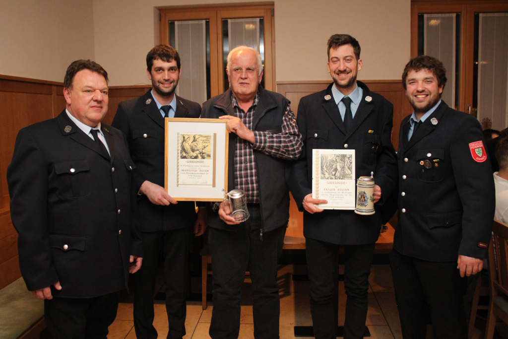 Auf 20 Jahre aktiven Dienst kann Kilian Failer zurückblicken und 1. Kommandant Alexander Huber bedankte sich bei seinem Vorgänger Michael Gallo mit einem goldenen Strahlrohr.